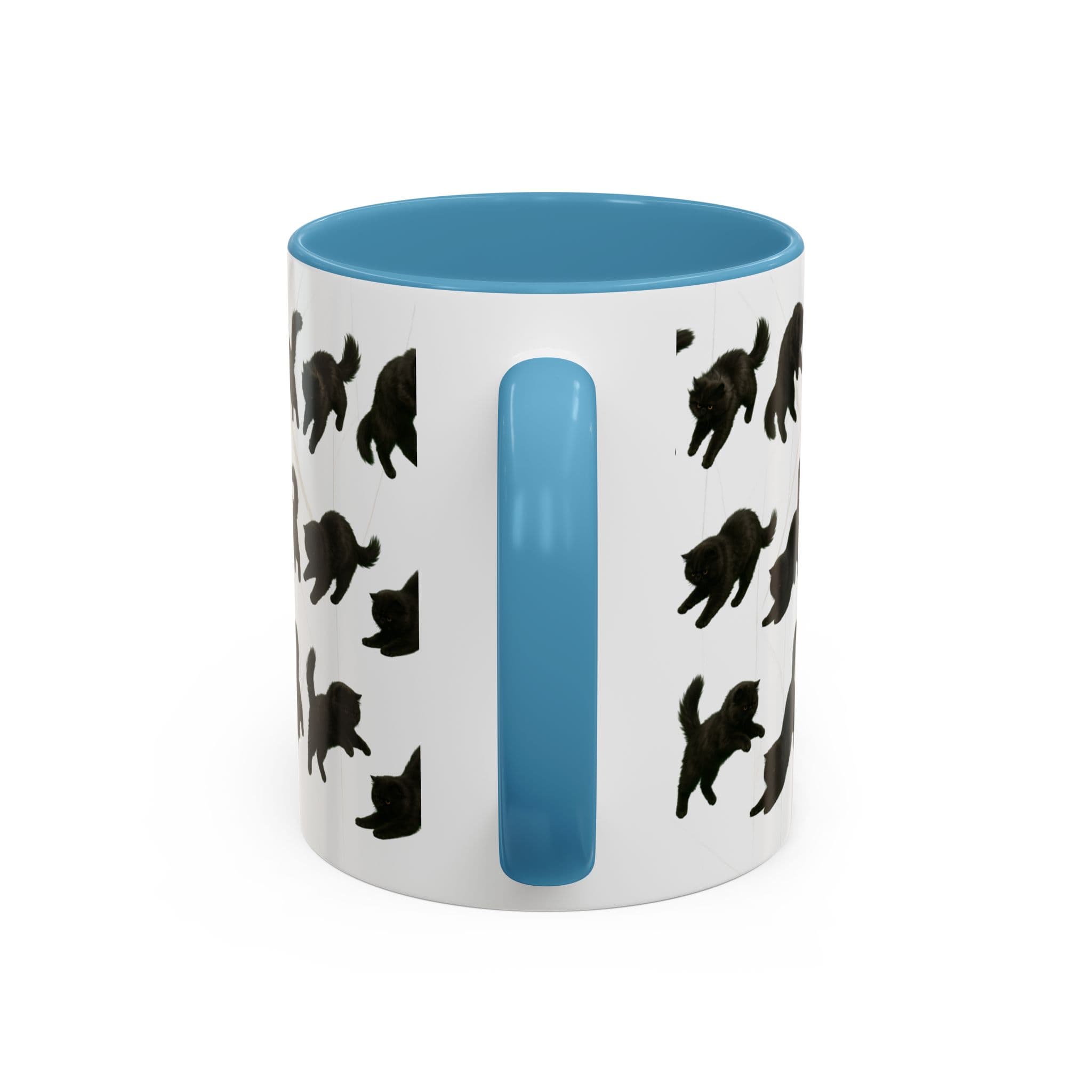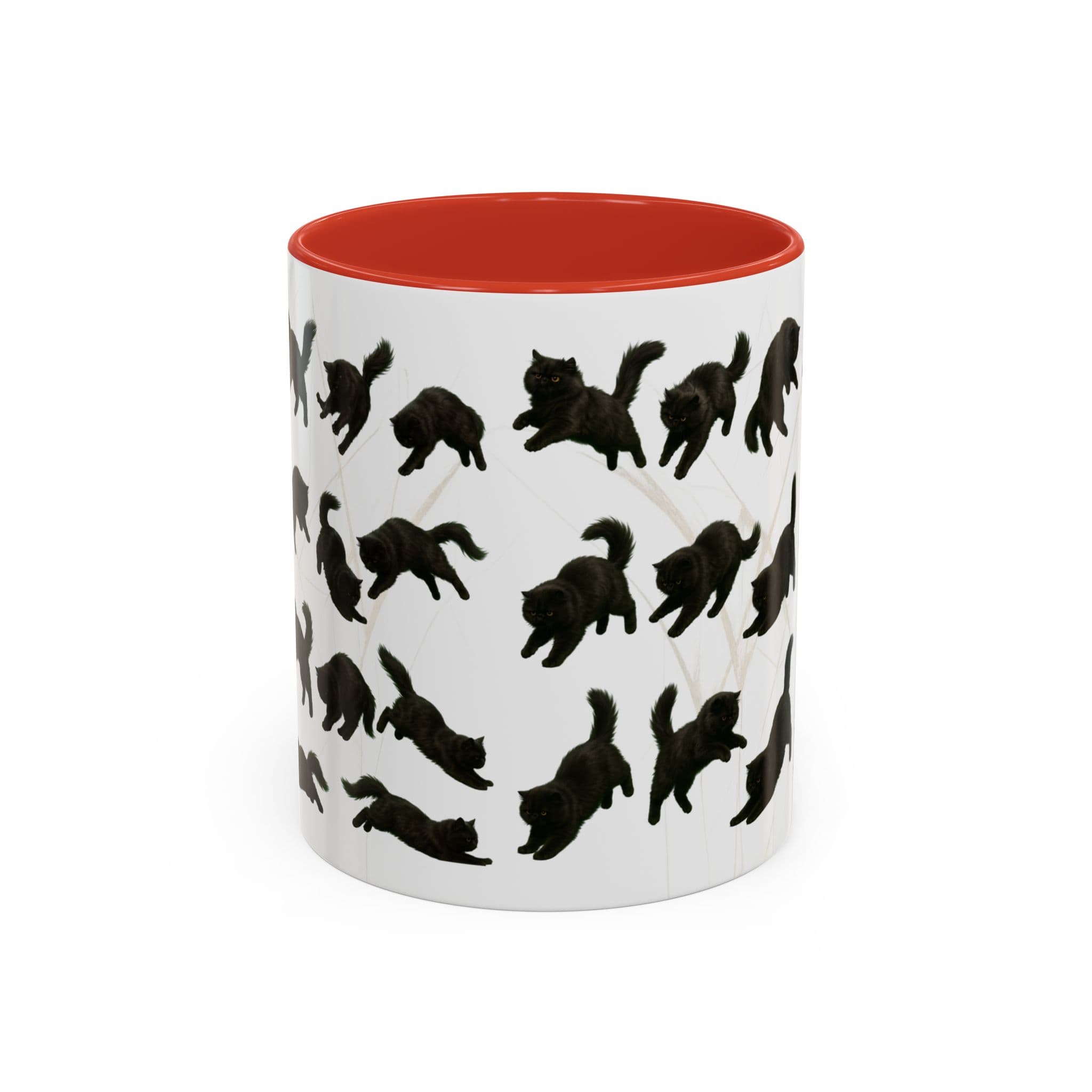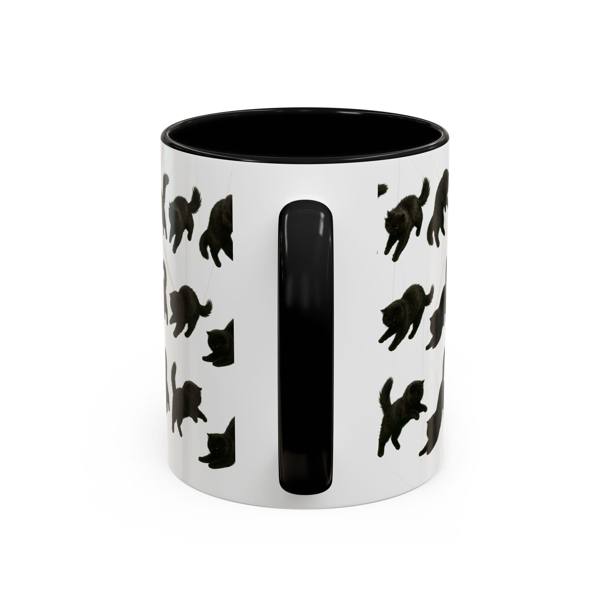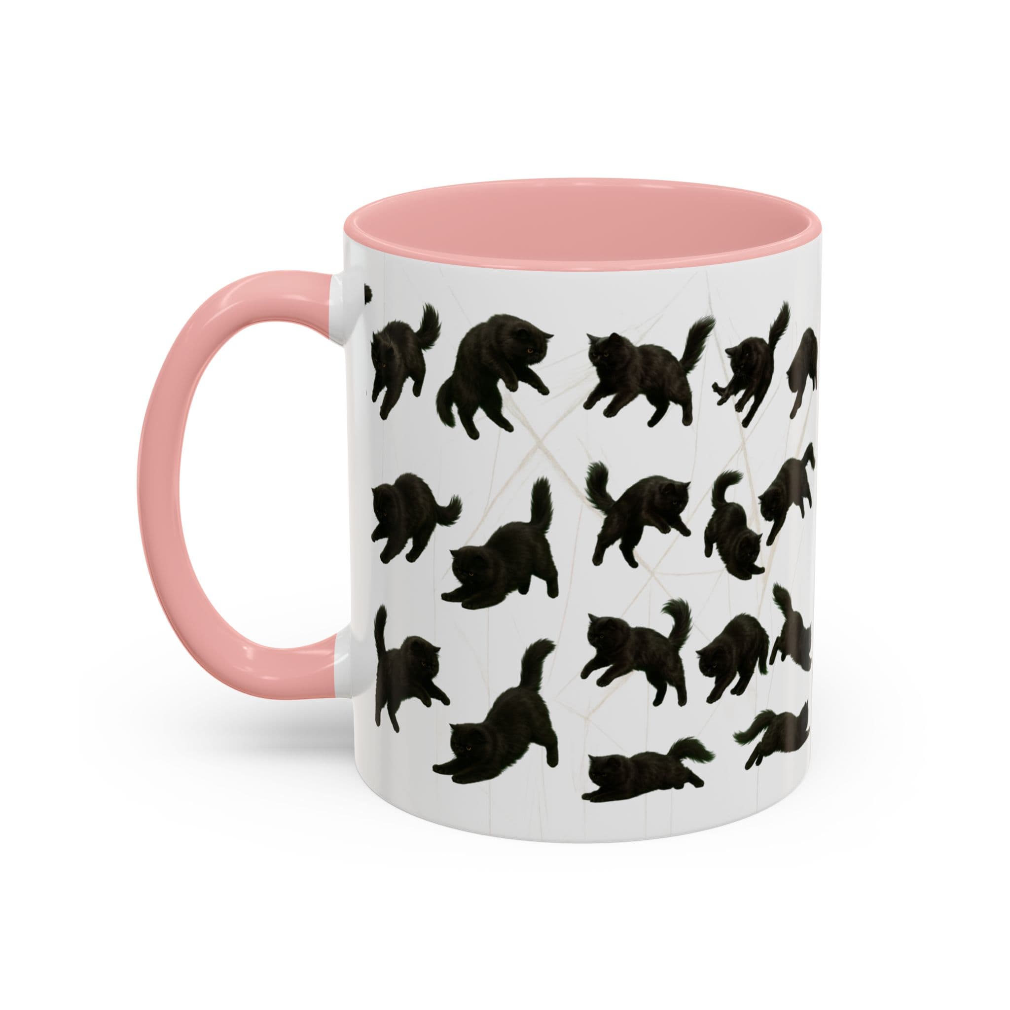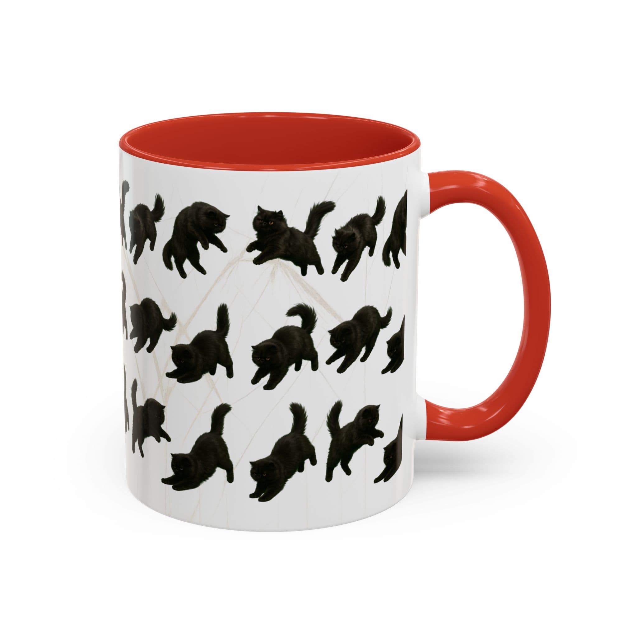 Meet the cat with attitude in every pose. This 11oz ceramic mug features a wraparound print of a mischievous flat-nosed black cat captured mid-stretch, mid-pounce, and mid-nap—perfectly expressing all the moods your coffee understands. The smooth gloss finish and colored interior make it a premium daily cup for anyone who speaks fluent feline.