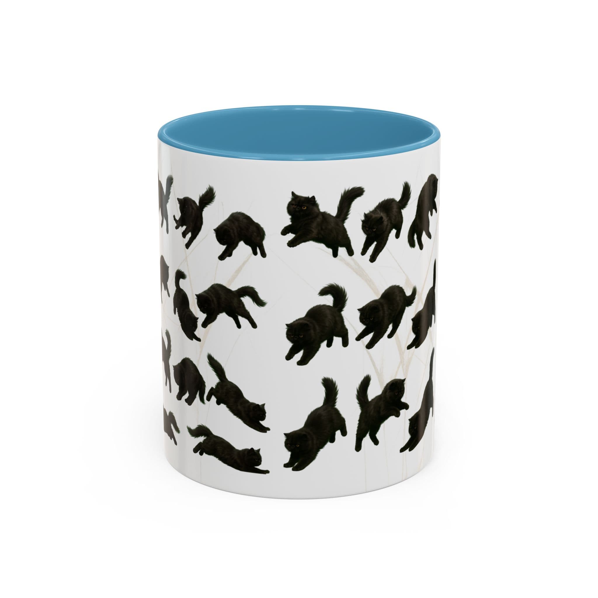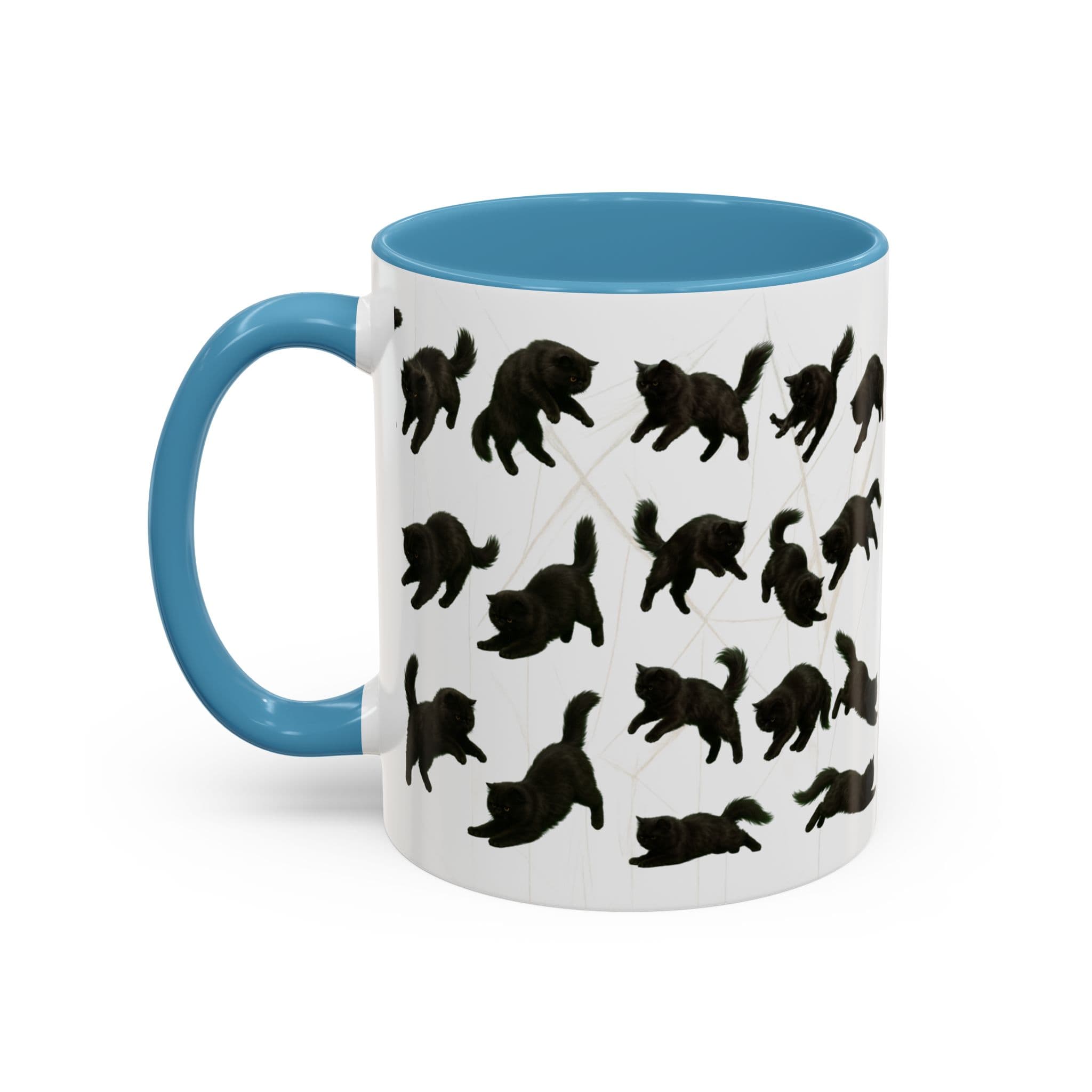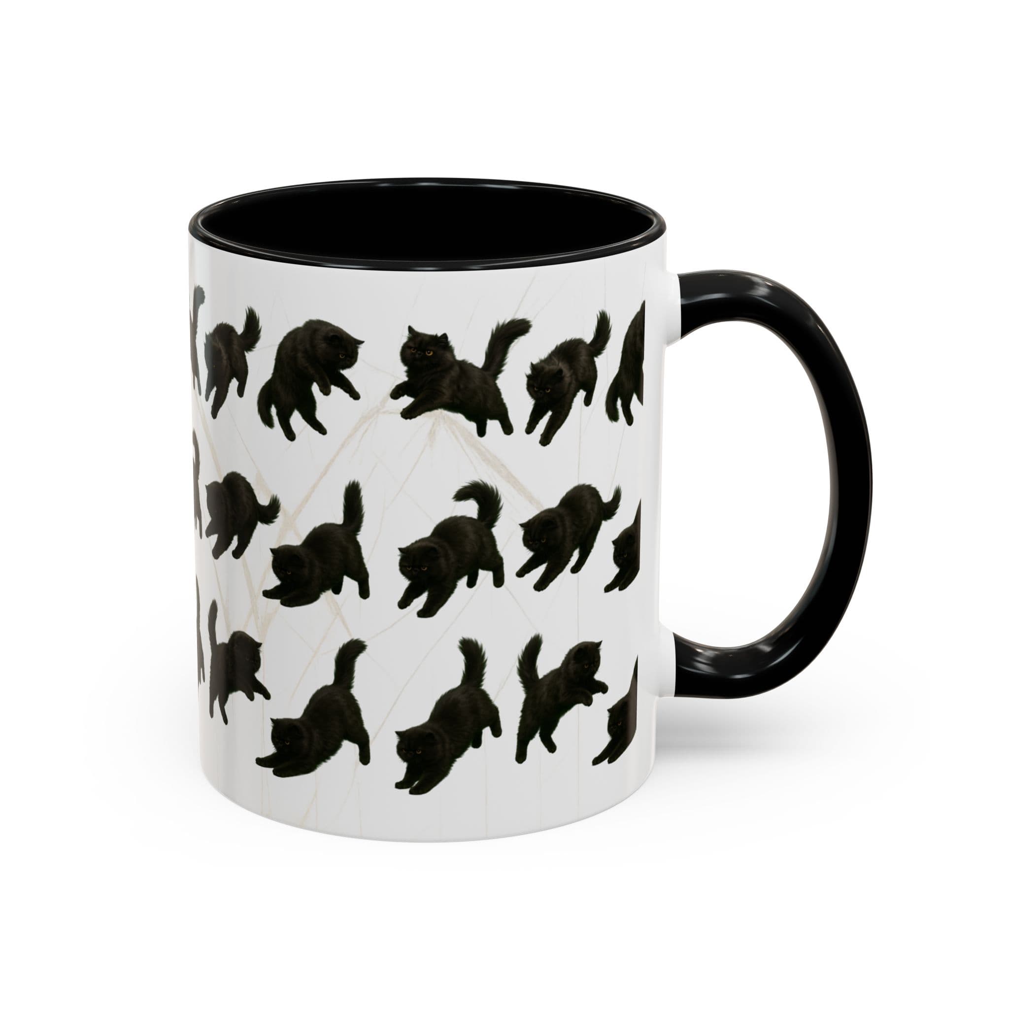 Meet the cat with attitude in every pose. This 11oz ceramic mug features a wraparound print of a mischievous flat-nosed black cat captured mid-stretch, mid-pounce, and mid-nap—perfectly expressing all the moods your coffee understands. The smooth gloss finish and colored interior make it a premium daily cup for anyone who speaks fluent feline.