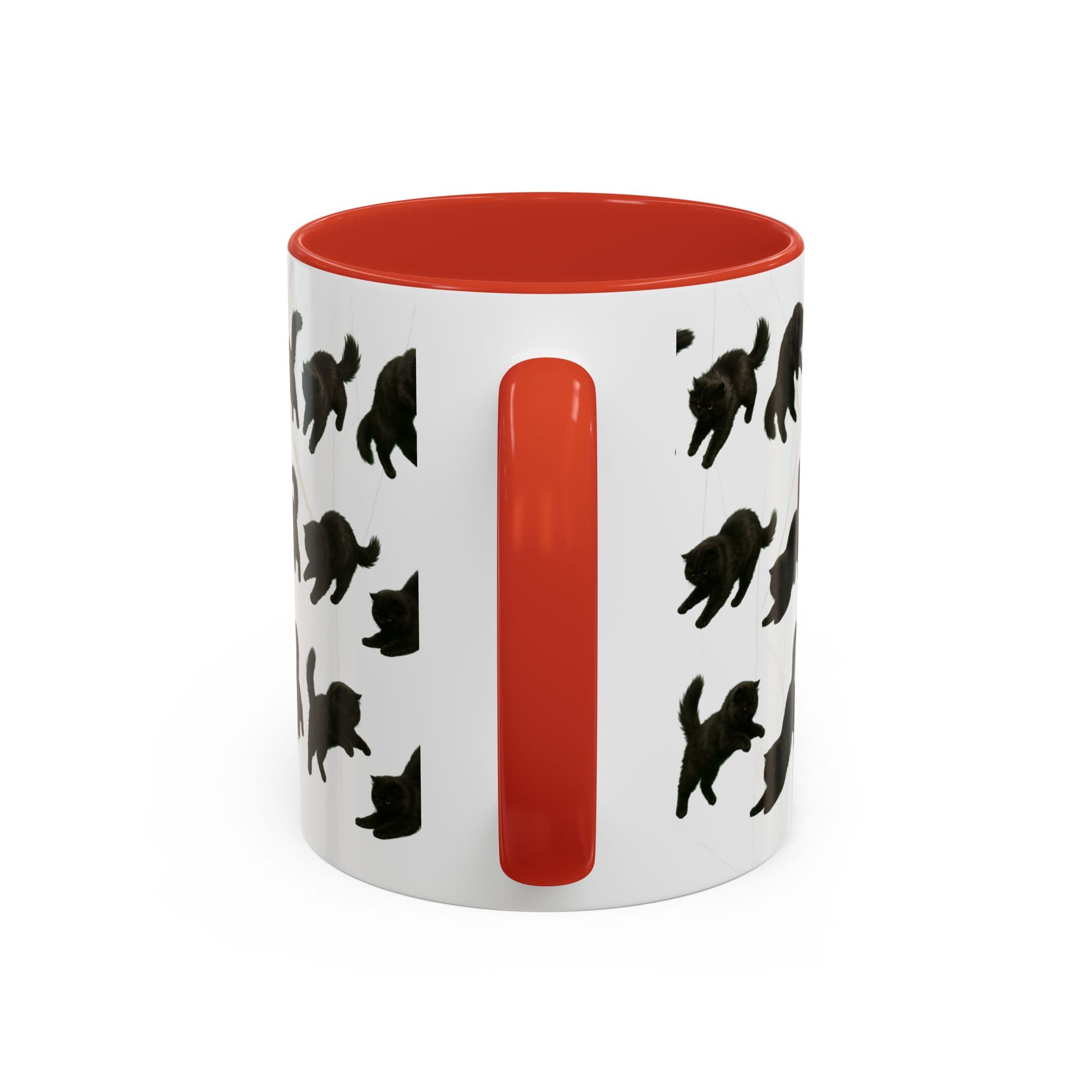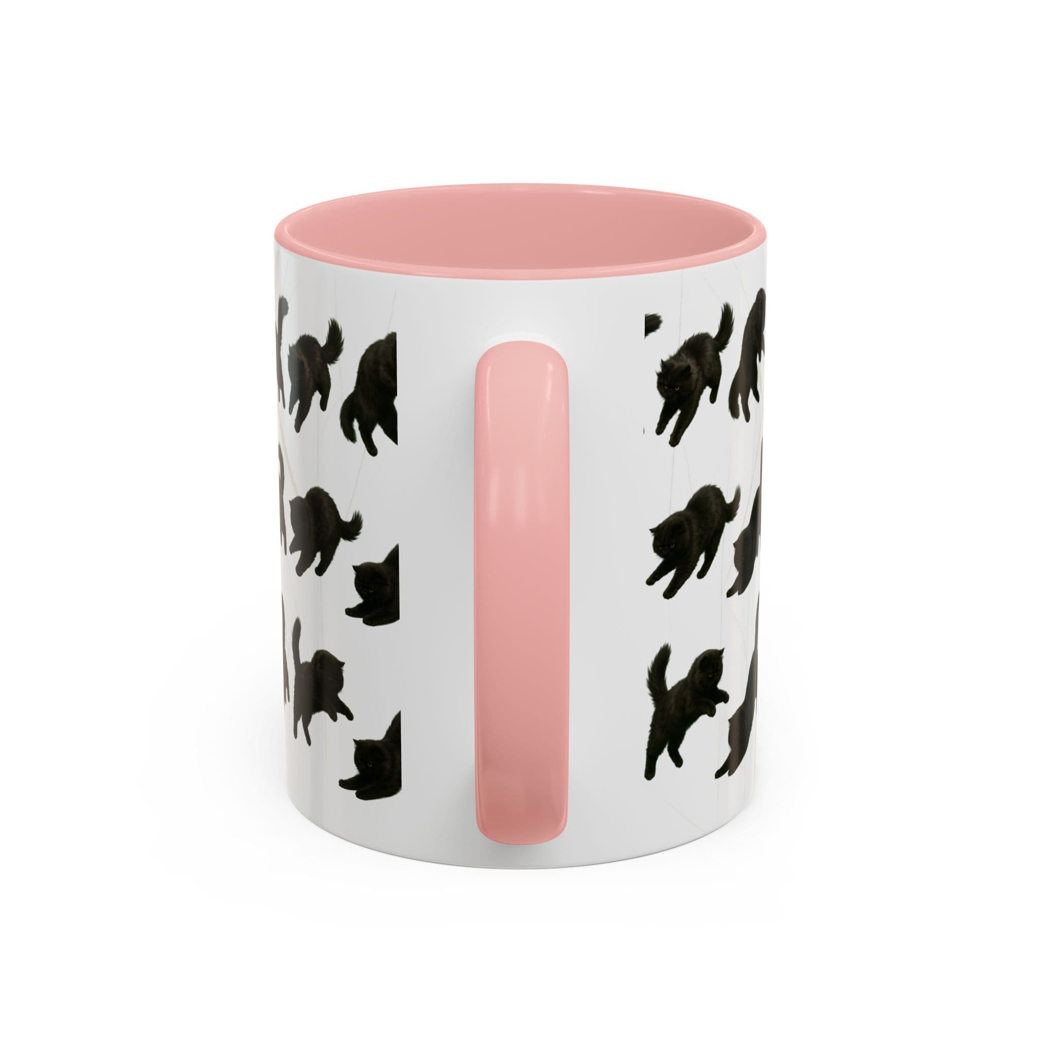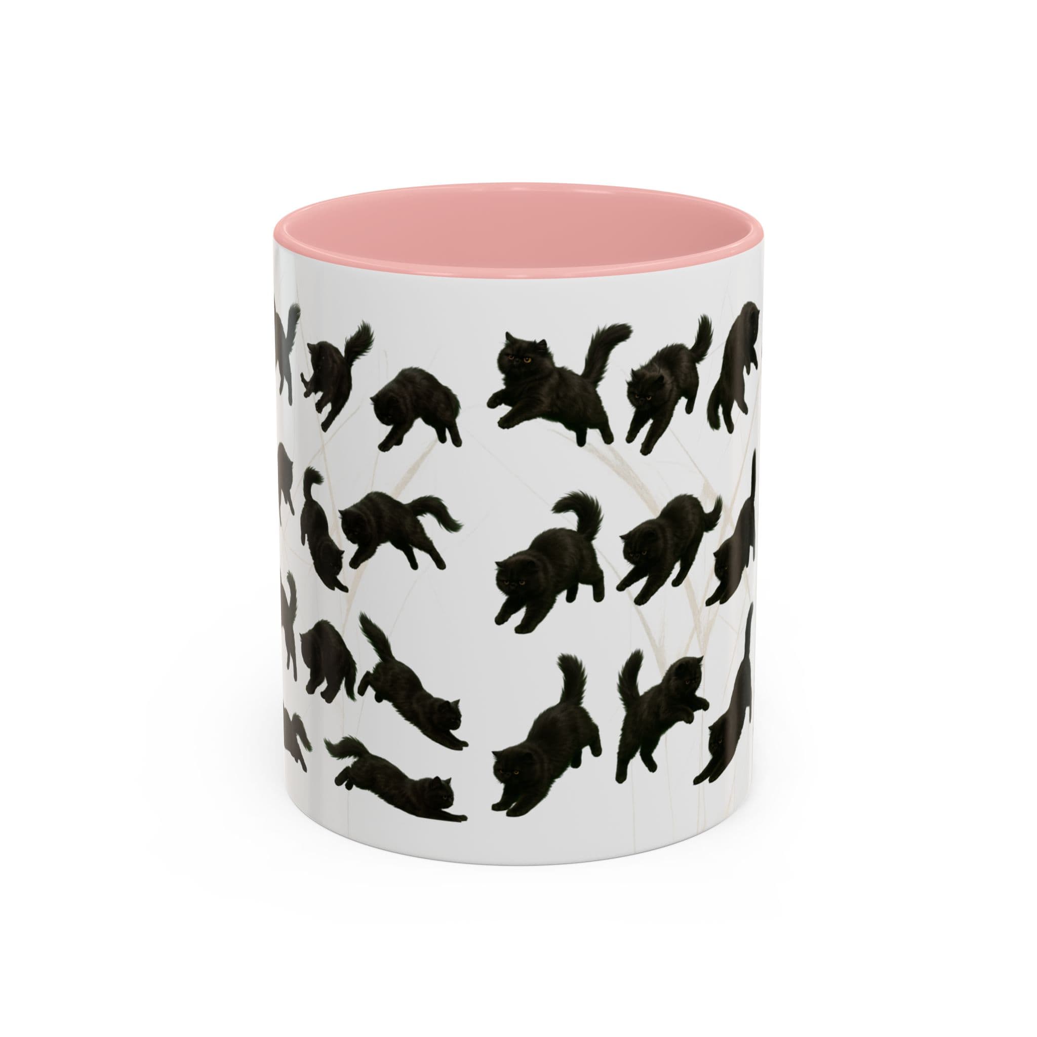 Meet the cat with attitude in every pose. This 11oz ceramic mug features a wraparound print of a mischievous flat-nosed black cat captured mid-stretch, mid-pounce, and mid-nap—perfectly expressing all the moods your coffee understands. The smooth gloss finish and colored interior make it a premium daily cup for anyone who speaks fluent feline.